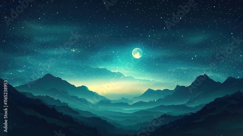 © PBMasterDesign, Naklejka premium Cosmic abstract background idea. A serene nighttime landscape featuring mountains under a starry sky and bright moon.