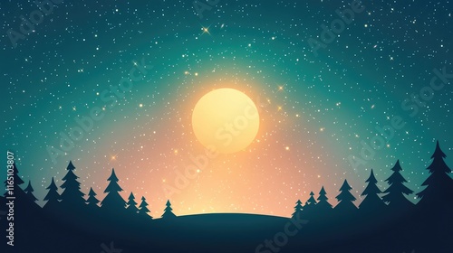 © Tin, Naklejka premium Cosmic abstract background idea. A tranquil forest landscape under a starry sky with a glowing sun setting.