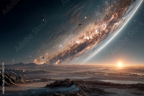 Naklejka premium Cosmic art beautiful galaxy swirling light distant celestial bodies high...