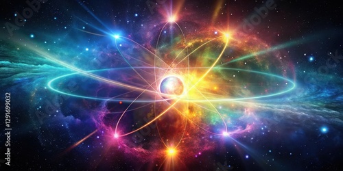 © Vibrant Visions Pixe, Naklejka premium Cosmic Atomic Structure A Vibrant Visualization of Subatomic Particles Orbiting a Central Core within a Nebula of Glowing Gases and Dust
