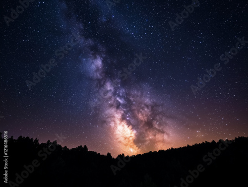 Naklejka premium Cosmic Brilliance: Milky Way over Forest Silhouette