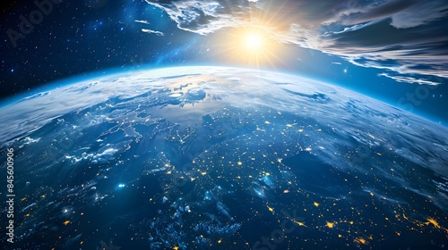 © Agri, Fototapeta premium Cosmic Dawn: Earth and Sky Awash in the Glow of Morning Light.. Panoramic view of the Earth, sun, star and galaxy. Sunrise over planet Earth, view from space