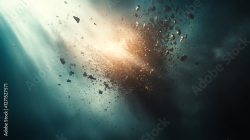 © heinng, Fototapeta premium Cosmic Debris Explodes Dramatically Illuminated by Bright Golden Light. AI Generated