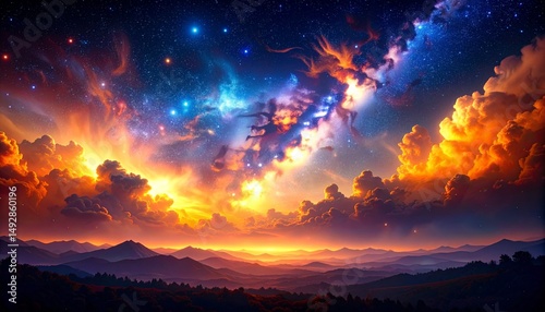 © Ashley, Naklejka premium cosmic dust clouds illuminate the night sky with orange and gold hues in a vibrant galactic display