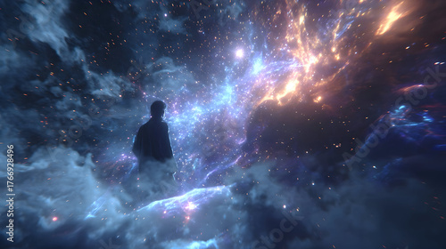 Fototapeta premium Cosmic Encounter: A Silhouette Amidst Celestial Fireworks