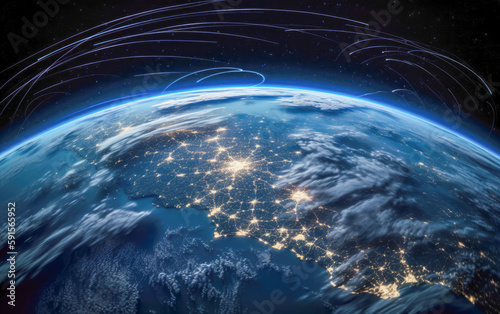 Obraz premium Cosmic Fusion: An Awe-Inspiring Visual Experience of Earth, Outer Space, and Cutting-Edge Technology