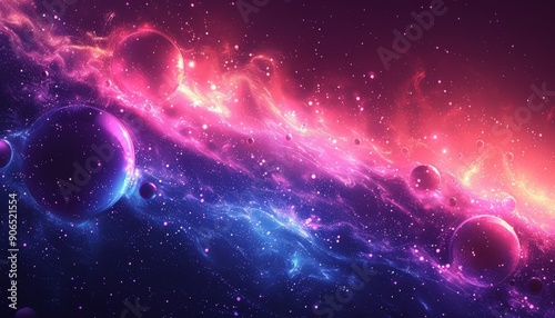 © pibi37.studio, Obraz premium Cosmic Galaxy with Pink and Blue Nebulae and Floating Planets. Space Art Illustration