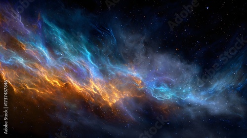 Fototapeta premium Cosmic illustration featuring a breathtaking display of celestial formations, showcasing vibrant hues of blue, orange, and purple, against a backdrop of a deep black space, offering an artistic...