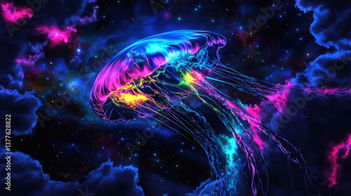 Fototapeta premium cosmic jellyfish floats in deep space, illuminated by vibrant colors against starry backdrop, evoking sense of wonder