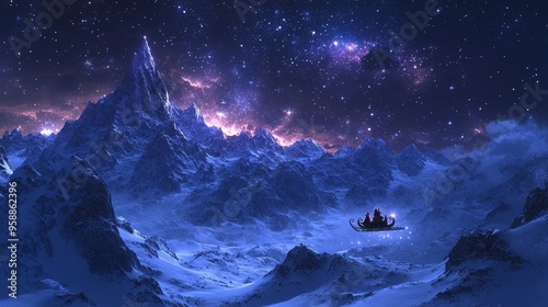 © VISA-3UK, Naklejka premium Cosmic Journey: A lone, ethereal airship glides over a breathtaking vista of snow-capped mountains beneath a star-studded sky, evoking a sense of adventure and wonder.