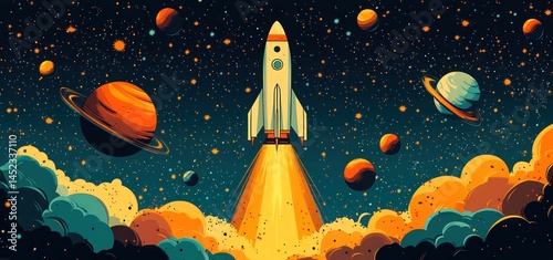 Naklejka premium Cosmic Launch: A Retro Rocket Ascends Through Vibrant Nebulae and Celestial Bodies