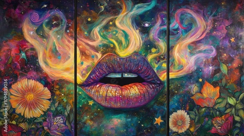Naklejka premium Cosmic Lips: A Triptych of Vibrant Galaxy and Floral Dreams
