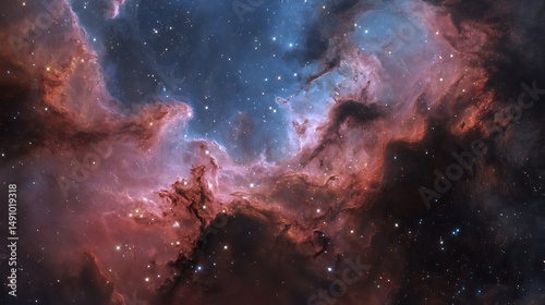 Fototapeta premium Cosmic Nebula Red And Blue Hues Stellar Cloudscape Deep Space Astronomy...