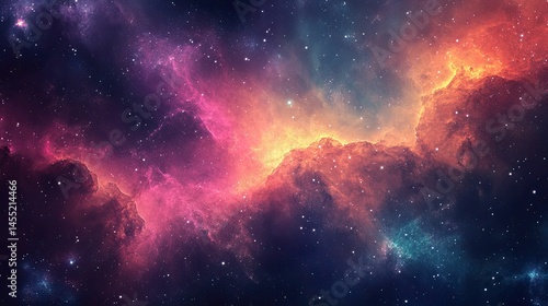 © Maxime, Fototapeta premium Cosmic Nebula: Vivid Hues of Pink, Orange, and Teal Gas Clouds Interspersed with Myriad Stars in a Dark Expanse of Space. A Celestial Tapestry.