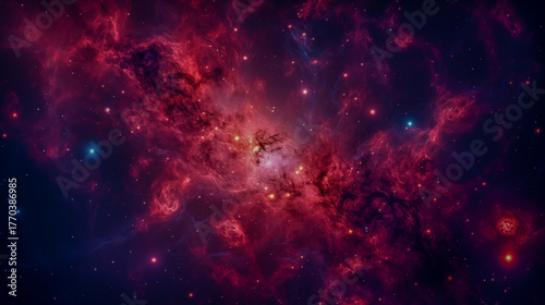 © xeionise, Fototapeta premium Cosmic Nebula with Vibrant Red and Blue Gas Clouds in Deep Space