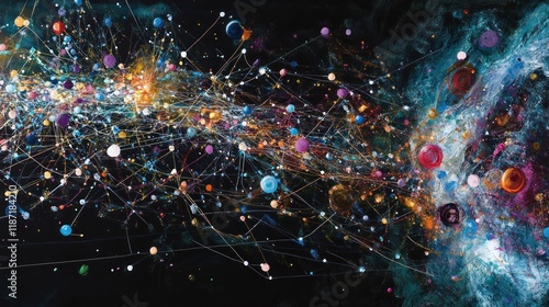 Obraz premium Cosmic Network: A vibrant abstract artwork depicting a sprawling network of interconnected nodes, resembling a celestial constellation or neural network.