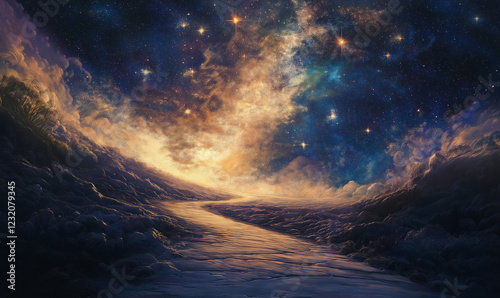 Fototapeta premium Cosmic Pathway Under a Glittering Blanket of Stars, Leading Into the Vast...