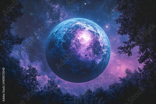 © AENI, Obraz premium Cosmic planet hangs above a twilight forest.