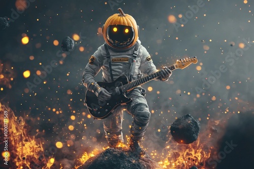 © 2D_Jungle, Fototapeta premium Cosmic Rock Star: The Pumpkin-Helmed Pilot's Fiery Solo
