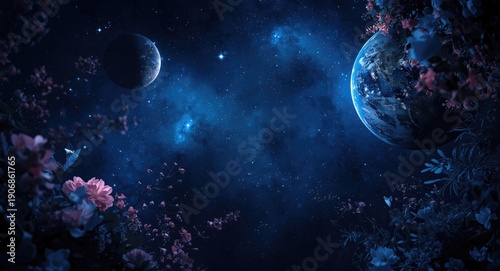 © vxnaghiyev, Fototapeta premium Cosmic setting in dark blue with bright stars planets and floral touches captured in wide angle
