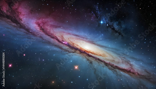 Fototapeta premium Cosmic spiral galaxy bathed in starlight. Vibrant colors swirl across a vast expanse of space, showcasing swirling nebulae and countless distant stars. A mesmerizing celestial panorama