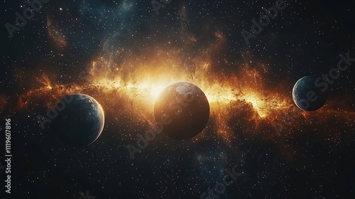 Obraz premium Cosmic View of Earth and Moon Orbiting in Harmony Amid Distant Stars and Nebulae