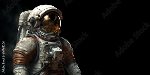 Fototapeta premium Cosmonaut or astronaut in a spacesuit, close-up and on an isolated black background. Generative AI