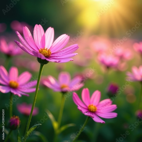 © Wasapol, Fototapeta premium Cosmos flowers in a lush garden, soft sunlight filtering through , texture, spring