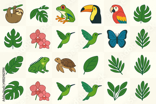 Fototapeta premium Costa Rica Biodiversity Icon Grid with Tropical Animals and Plants in Flat Vector Style