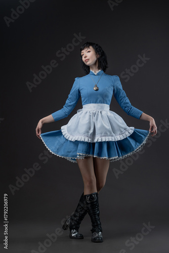 Naklejka premium Costumed Gothic Alice: woman in blue Victorian dress with apron, Wonderland...