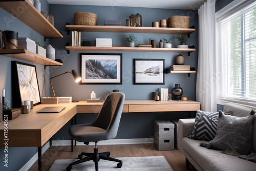 Fototapeta premium Cosy and stylish modern home office interior design, office workspace in blue...