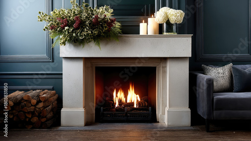 Naklejka premium Cosy fireplace with burning fire, elegant mantel, floral arrangement, candles, wood stack, dark wall, inviting living room