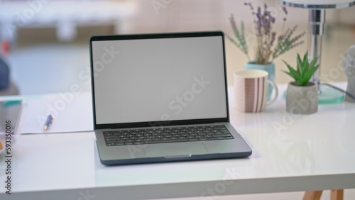 Fototapeta premium Cosy home office desk with laptop computer. Still life, no people, blank screen.