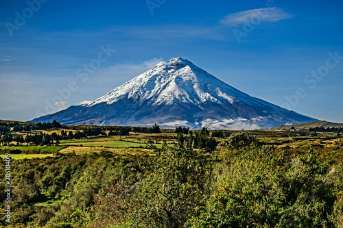 © vaclav, Fototapeta premium Cotopaxi volcano with sunset light shinning on it's slopes, and crops in the foreground, Ecuador.