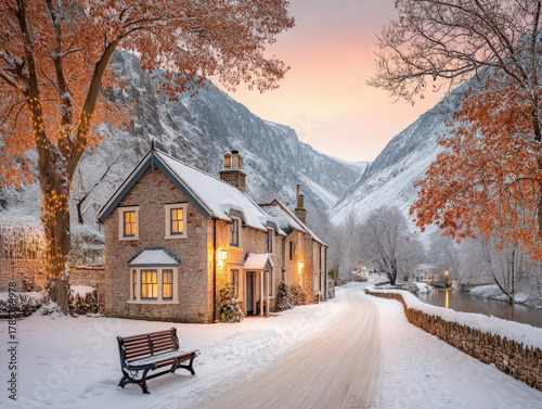 © sharafmaksumov, Fototapeta premium Cottage in the snow in the uk