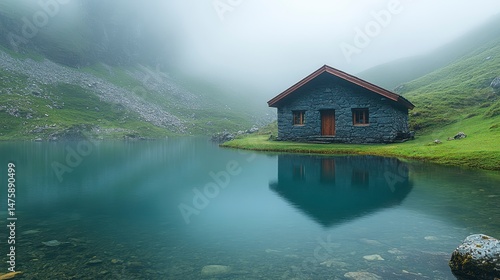 Fototapeta premium Cottage on tranquil lake with misty mountains in the background, calm nature...