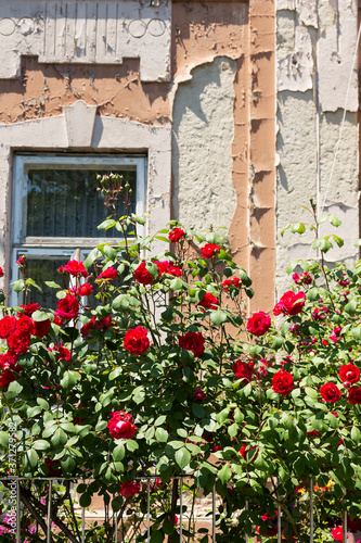 © Elena, Naklejka premium cottage with beautiful red roses around the door