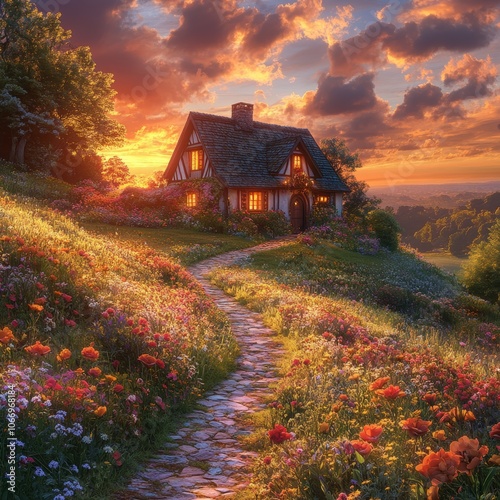 Naklejka premium Cottagecore Sunset Flower Path to Charming Home