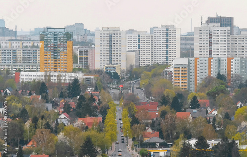 © Kost9, Obraz premium Cottages and the big city. The road to the big city. small, comfortable, European private houses and large multi-story residential buildings. Suburb. Panorama, landscape of the city. Lots of trees.