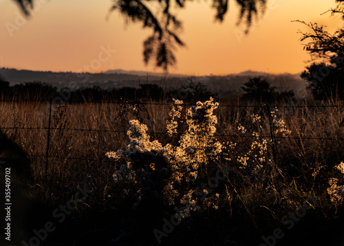 © Jacek, Fototapeta premium Cotton balls growing on a fence in sunset
