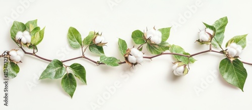 © MetaPixel, Naklejka premium Cotton branch with green leaves and white cotton bolls on light background with ample copy space