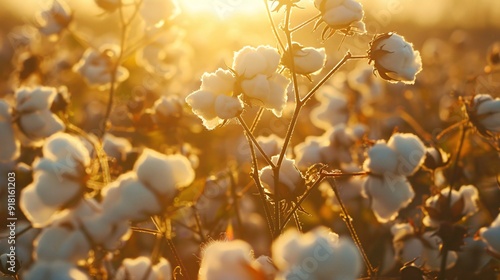 © Ajay, Fototapeta premium Cotton field at sunrise. Beautiful nature landscape with cotton flowers.