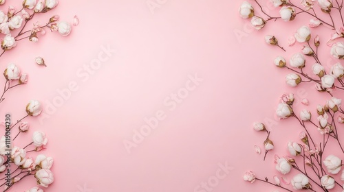 © MetaPixel, Naklejka premium Cotton flower branches elegantly arranged on soft pink background creating a serene atmosphere for text or design elements in still life photography