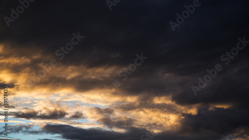 © Anthony, Naklejka premium Coucher de soleil et reflets jaunâtres sous un gros nuage à la base bien sombre