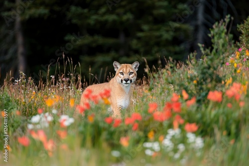 © Outkast, Fototapeta premium Cougar staring, in wildflowers meadow, forest backdrop, for wildlife conservation