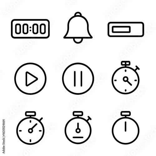 © Влада Яковенко, Fototapeta premium Countdown Timer Icons. Outline icon set of countdown timer: digital countdown, bell alarm, progress bar, start button, pause