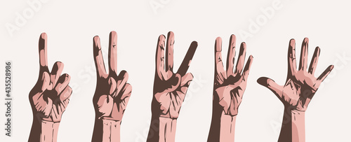 © unimaginary, Fototapeta premium Counting fingers on gray background. Vector set of hands with counts on the fingers from one to five.