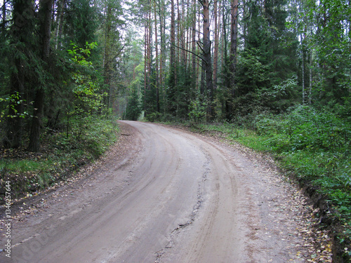 Fototapeta premium Country dirt road in pine forest, turn of the road, autumn time