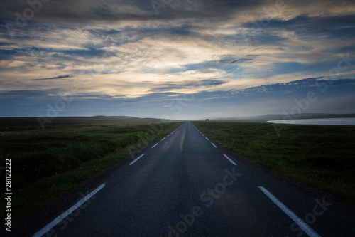 © ekim, Naklejka premium Country road across the tundra landscape in summer night. Finnmark, Norway