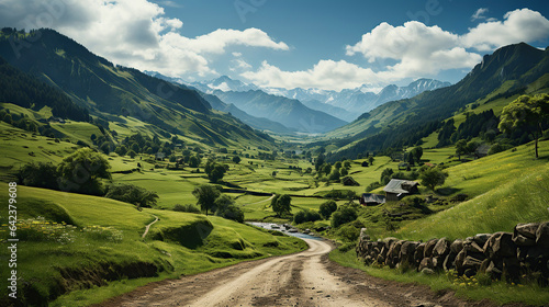 Naklejka premium Country road and green mountains in summer.